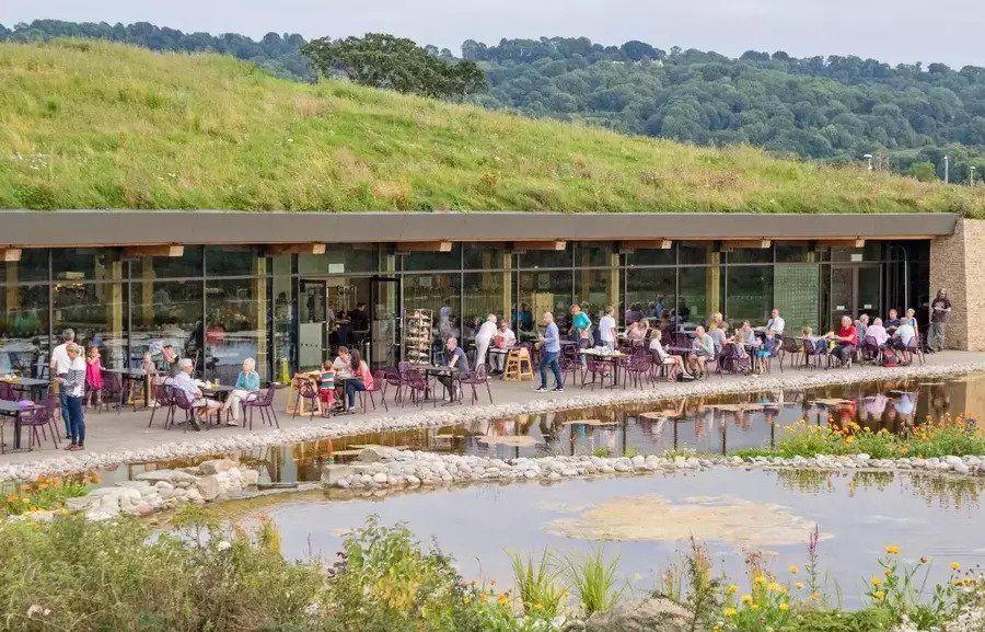 This impressive services has a grass-carpeted roof and floor-to-ceiling windows constructed around a relaxing duck pond. Homecooked meals such as fish and chips and steak and ale pie are served to order and local produce including home-baked bread and regional cheeses can be bought from the on-site farm shop. Dogs are allowed in the foyer areas of the the main buildings and parking is free for three hours.