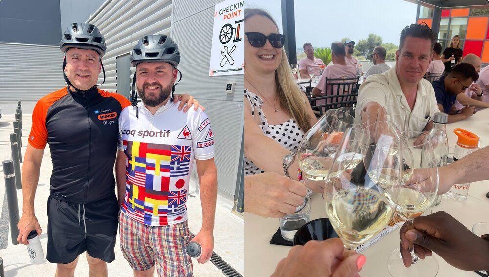 The cycling group got to explore the cool shaded woodland and cobbled medieval streets, all accompanied by Ingo’s Bumper cycling shirt; and the wine tasting group had an insightful tour around the winery and then sat on a shaded terrace and sampled the delicious wines made at Clos D’Agon Bodega.